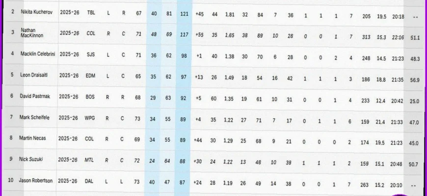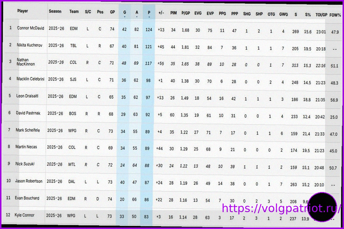 По данным на 30 марта 2026 года, канадский форвард Коннор Макдэвид из команды «Эдмонтон Ойлерз» занимает лидирующую позицию в рейтинге самых результативных игроков регулярного чемпионата Национальной хоккейной лиги сезона 2025/2026. Второе место в этом престижном списке уверенно удерживает Никита Кучеров.